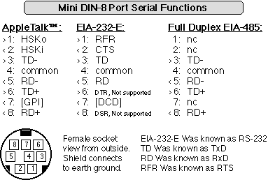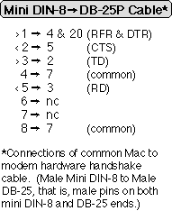 Normal Mini DIN-8 to DB-25P (Macintosh to modem) hardware handshake cables are constructed so as to provide a conversion of AppleTalk to EIA-232-E by connecting RD+ to common, opening TD+, and connecting HSKo to both RFR and DTR (RFR and DTR thus shorted to each other). In some cases GPI is opened too, but normally it's connected to DCD, which we think preferable (though it's not presently required). This type cable should be used to establish an EIA-232-E serial connection from the Model 308/9 to a computer with a DB-25 connector. Most systems don't utilize DTR and DSR signaling, and the Model 308/9 does not support these lines in the usual EIA-232-E mode. However, version 2.2 and later network cards provide a hardware echo square pin jumper for those rare cases where required (jumper diagrams are on the card).